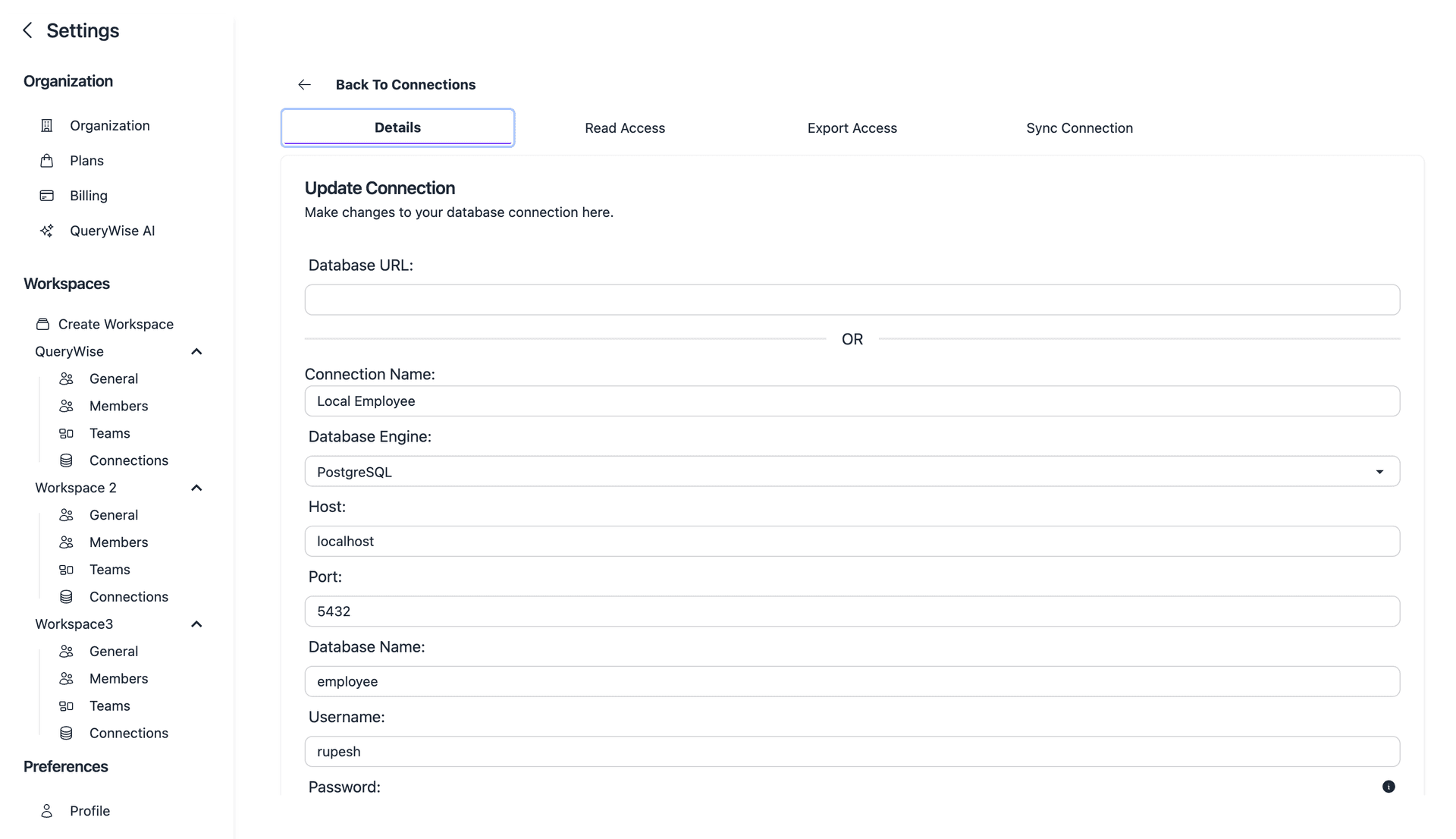On Clicking connection, one can see the connection details. one can control the read access & export access.